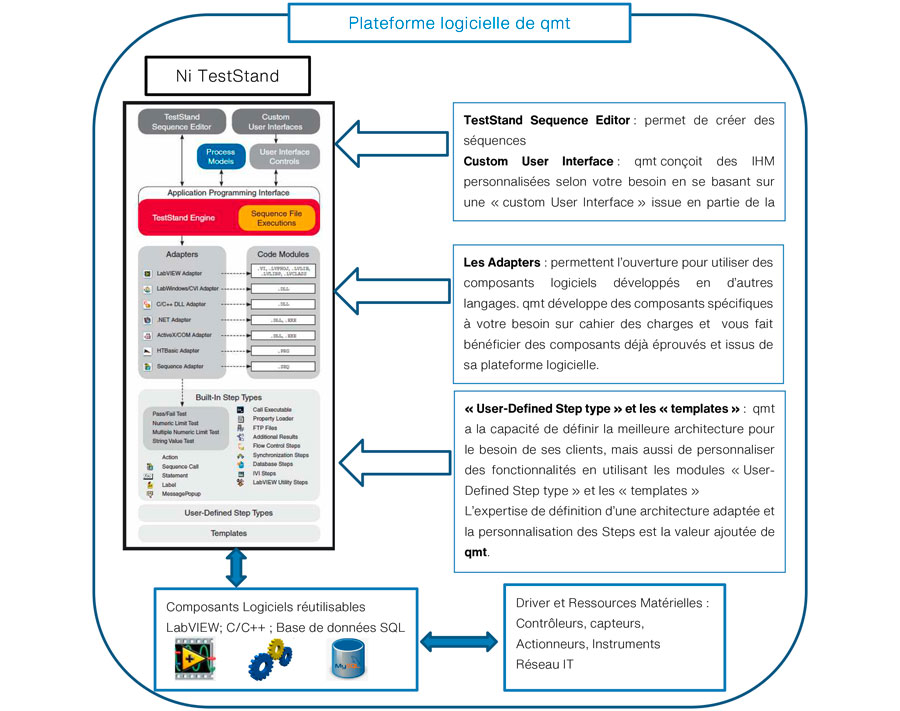 qmt hat TestStand in seine Softwareplattform integriert, sodass unsere Kunden von unserer 30-jährigen Erfahrung und Kapitalisierung profitieren können. Unsere Softwareplattform integriert mehrere bereits bewährte, robuste und wiederverwendbare Komponenten. Dieser Ansatz, der auf der Wiederverwendung und der Definition angepasster Architekturen basiert, ermöglicht es, Entwicklungen zu beschleunigen und gleichzeitig robuste Lösungen bereitzustellen.