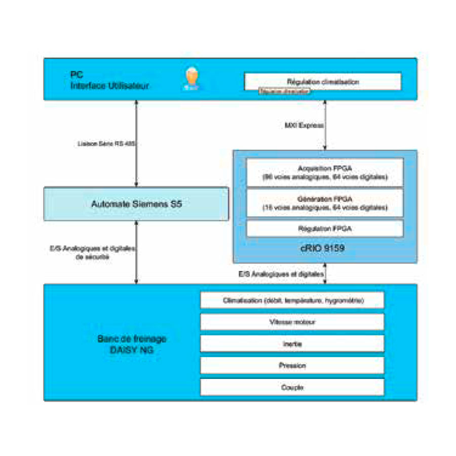Two types of regulation are then mobilized: regulation on the control PC for air conditioning and regulation on board an FPGA (integrated in the RIO MXI-Express chassis) for rapidly changing critical parameters (speed ramps, pressure, torque) .