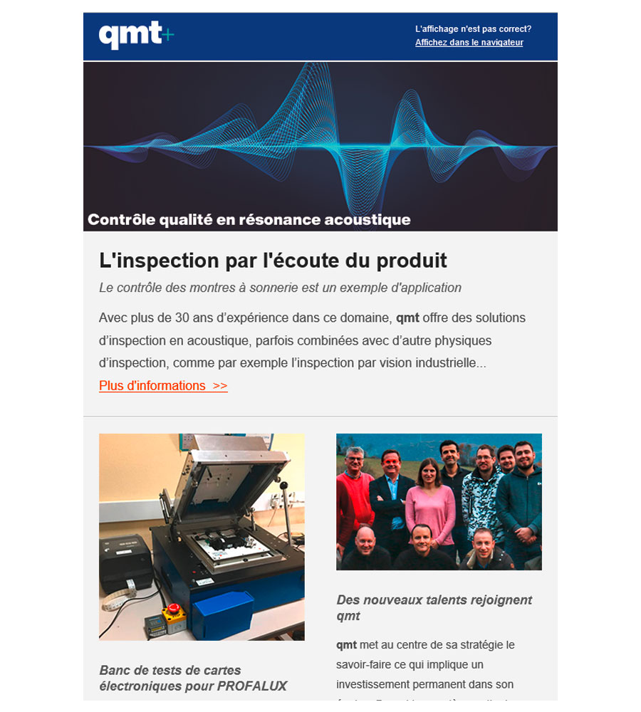 qmt communique en priorité sur ses savoir-faire, les technologies utilisées et les innovations dans un contexte de prestations mais aussi de produits. En compléments nous communiquons sur les nouvelles, l'équipe qmt et les succès réalisés
