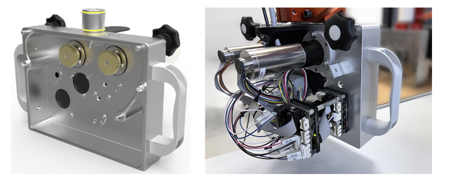 Conception et réalisation d’un système optique s’intégrant parfaitement au produit à tester. Il est placé manuellement par l’opérateur grâce à une pièce de guidage réalisée par qmt. Sa compacité offre un angle de vue spécifique pour la mesure d’écart de lobes en dynamique. Ce système opto-mécanique est composé d’un éclairage coaxial, d’une caméra et optique haute résolution, de composants mécaniques personnalisés