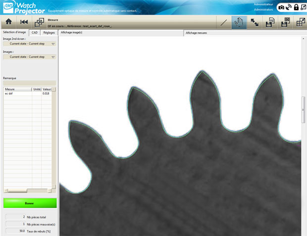 La nouvelle fonction QMTCalqueControl est maintenant disponible dans la plateforme QMT Vision Inspector, donc transversale à la gamme de solutions de Qualimatest. Elle permet le contrôle automatique par la mesure de l'écart entre la valeur théorique du plan et la valeur réelle de la pièce sur l'ensemble du contour. Il est donc maintenant possible de contrôler rapidement et automatiquement l'ensemble de la géométrie d'une pièce sans programmation. Un système de filtrage paramétrable est proposé afin de ne pas tenir compte des petites imperfections et poussières.
