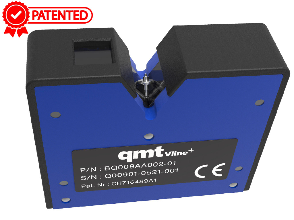 Pour faciliter cette opération, le posage qmtvline a été développé. C’est deux supports transparents plats qui créent un certain angle entre eux, la pièce peut ainsi naturellement « pencher » grâce à la gravité. Le chemin optique de la lumière émise par la source est modifié afin que l’image vue par la caméra ne soit plus de dessus mais de côté, ainsi les dimensions mesurées correspondent à la réalité. Il n’est ainsi plus nécessaire de positionner précisément la pièce le long de son axe de rotation donc plus d’opération de dégauchissage.